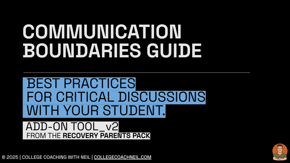 Geared for parents, our Communication Boundaries Guide is a general best practices document that outlines how to most effectively communicate with your college student. This can be applied in a number of different situations over their time in college (and beyond), and is built to ease the tension in otherwise challenging conversations.